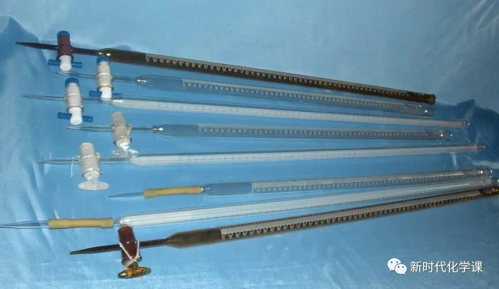 前者用于量取对玻璃管有侵蚀作用的液态试剂;后者用于量取对橡皮有侵蚀作用的液体。滴定管容量一般为50mL,刻度的每一大格为1mL,每一大格又分为10小格,故每一小格为 0.1mL。精确度是百分之一。即可精确到0.01ml . 滴定管为一细长的管状容器,一端具有活栓开关,其上具有刻度指示量度。一般在上部的刻度读数较小,靠底部的读数较大。